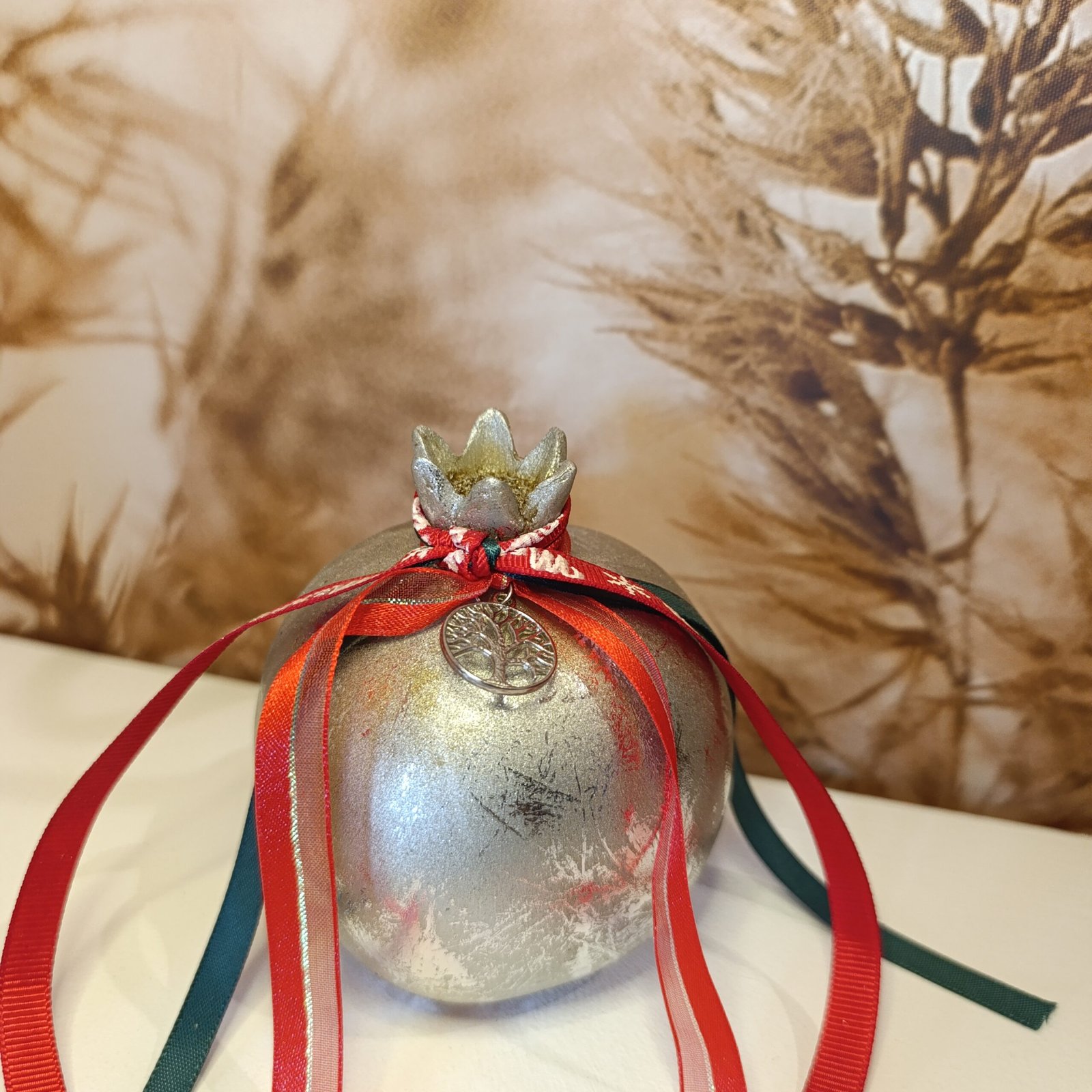 Το Pomegranate Glow είναι χειροποίητο γούρι ρόδι, με χρυσές και ασημένιες λεπτομέρειες που του χαρίζουν κομψή λάμψη και πολυτέλεια. Σύμβολο ευημερίας και αφθονίας, φέρνει τύχη και θετική ενέργεια στον χώρο ή στο δώρο σου.