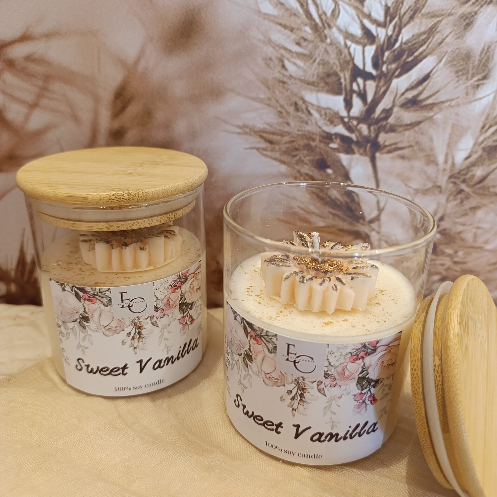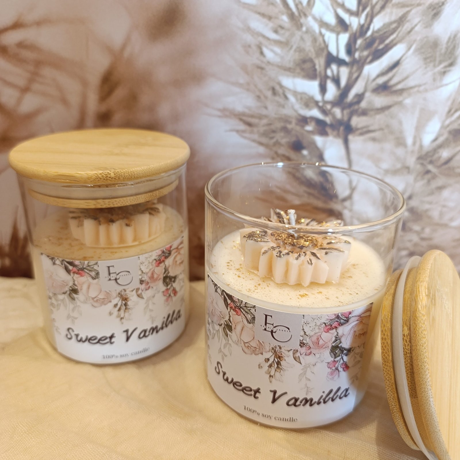 Sweet Vanilla- Αρωματικό κερί με ζεστό και γλυκό άρωμα βανίλιας. Δημιουργεί μια cozy και φιλόξενη ατμόσφαιρα, ιδανική για στιγμές χαλάρωσης στο σπίτι. Καίγεται ομοιόμορφα και γεμίζει τον χώρο με απαλή γλυκύτητα που ηρεμεί τις αισθήσεις.